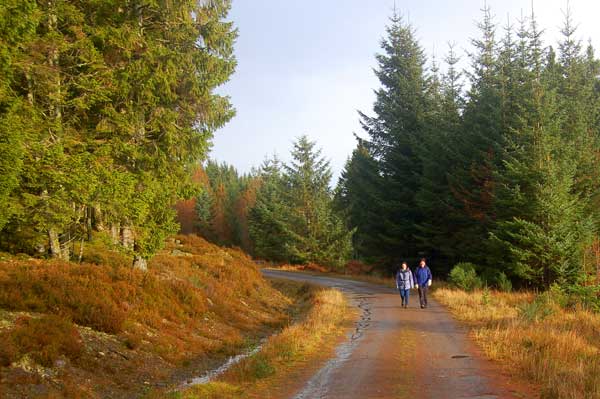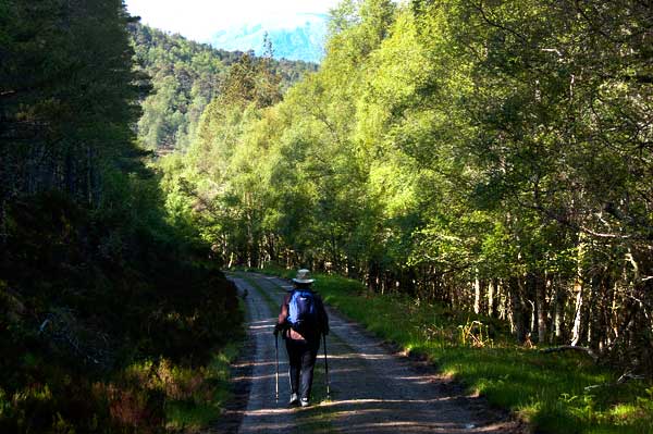 After some 3 miles the route leaves the forest road on the left (signposted) and heads downhill on a narrower, rougher track and zig-zags to the gate on the public road at Dog Falls. Crossing the road takes you into the FCS car park - an ideal spot for a break with picnic tables and toilets, open Easter - October. Here you might like to spend a bit of time exploring the waymarked walks around Dog Falls and Coire Loch. You should be able to pick up a copy of the Glen Affric Guide from the dispenser at the information board but you can download a copy: FCS Glen Affric Guide.