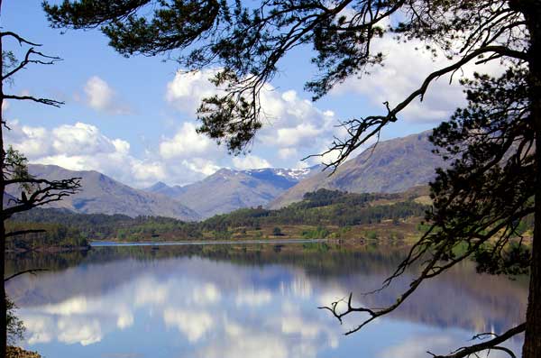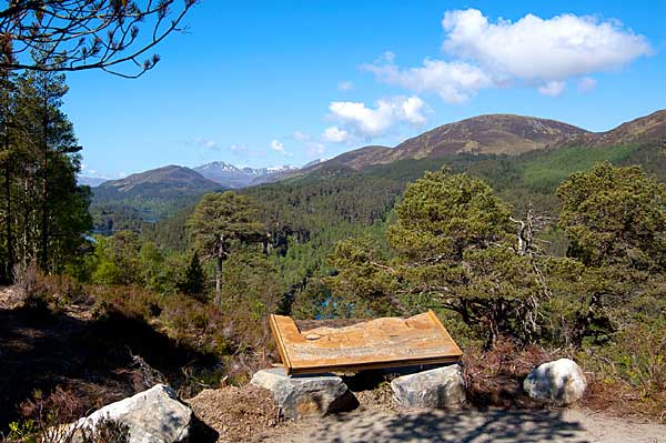 The route continues from the car park via the wooden bridge over the River Affric and heads steeply uphill through woodland having some excellent specimens of Scots Pine. At the junction, turning right and after a short distance you arrive at the Glen Affric Viewpoint. Situated above the Beinn a' Mheadhoin Dam it gives superb views along Glen Affric to Mam Sodhail and Carn Eighe, the highest mountains north of the Great Glen, and onwards to the mountains of Kintal.